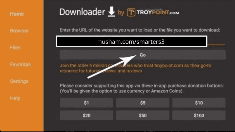 Launch Downloader and type the following URL: https://www.iptvsmarters.com/smarters.apk. Click Go and then click Install when prompted.